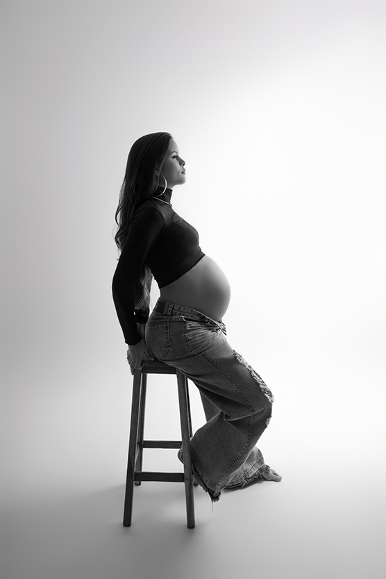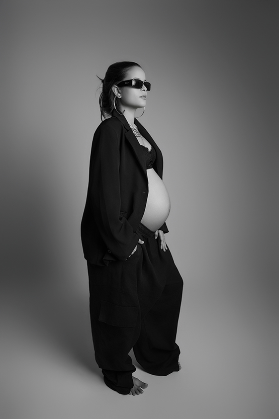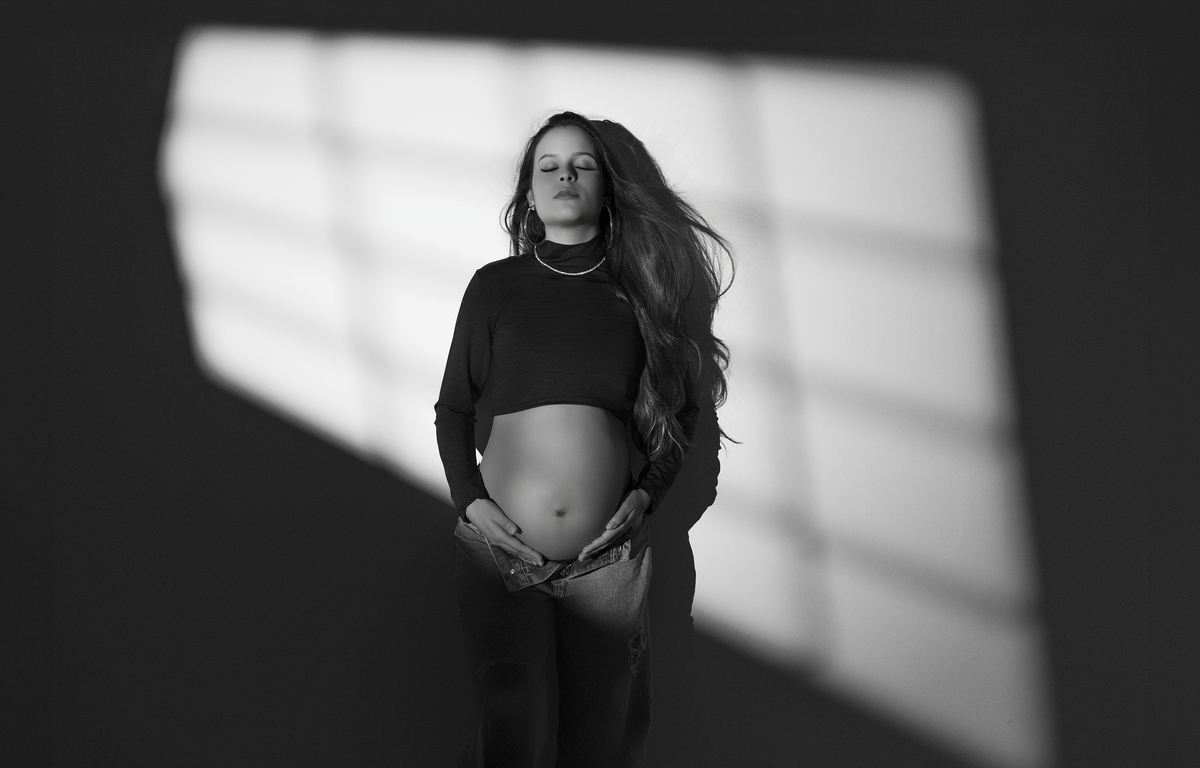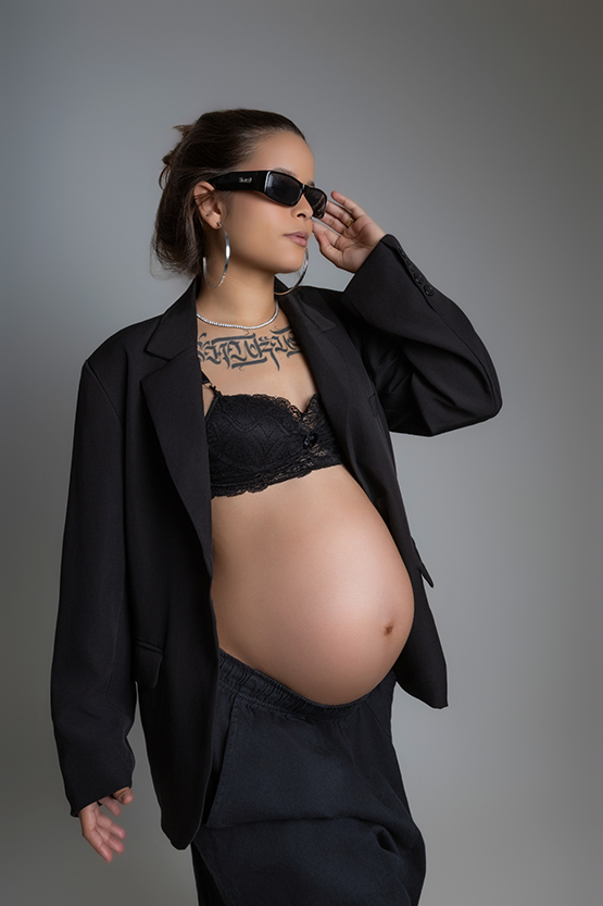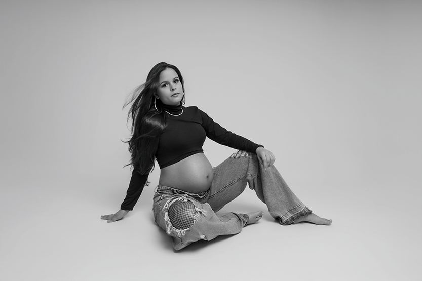Eduarda chegou com clareza. Não sobre poses ou referências, mas sobre quem ela é. Mãe de primeira viagem, ela trouxe para o ensaio gestante em estúdio uma presença firme, marcada por personalidade e um estilo que não pede permissão.