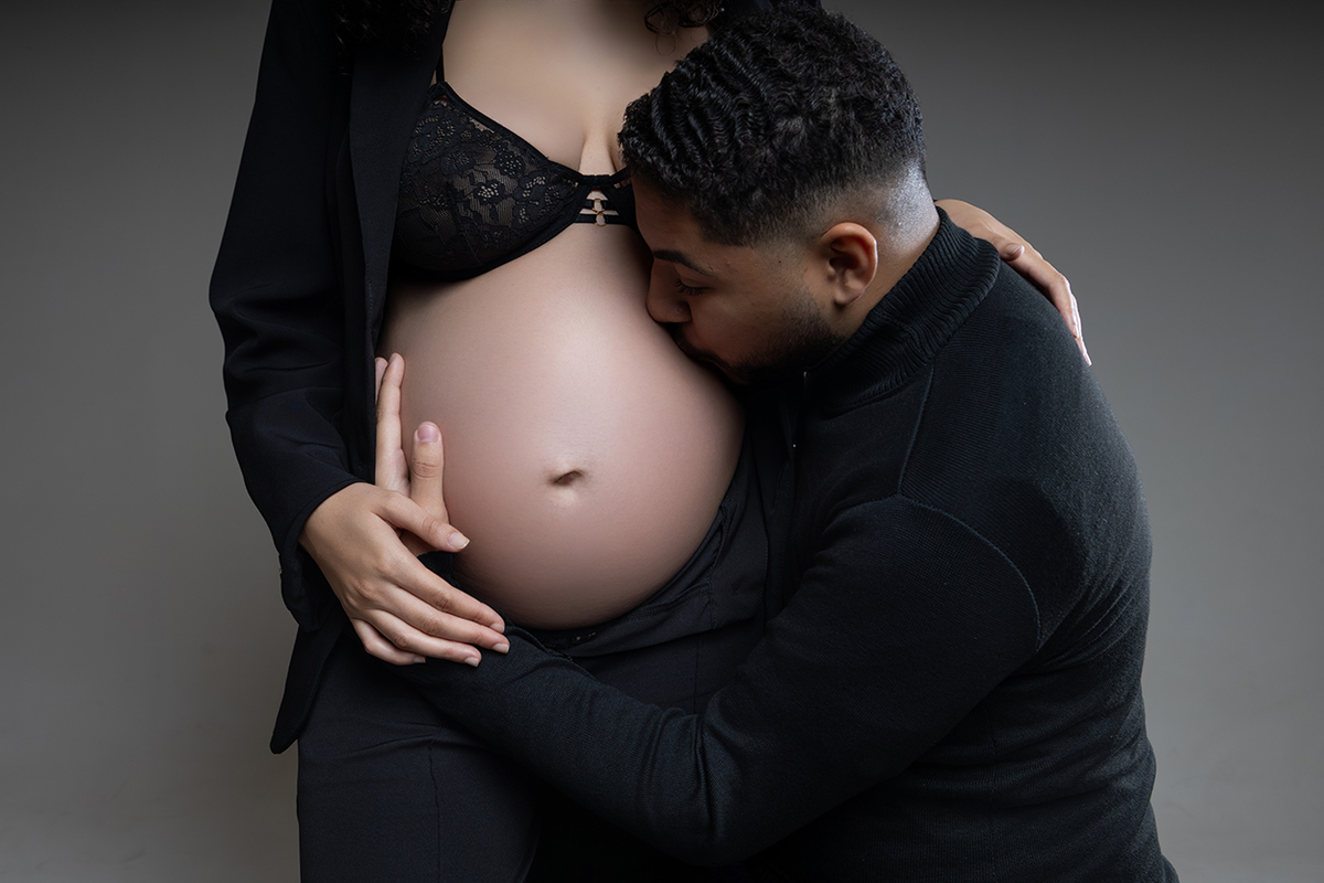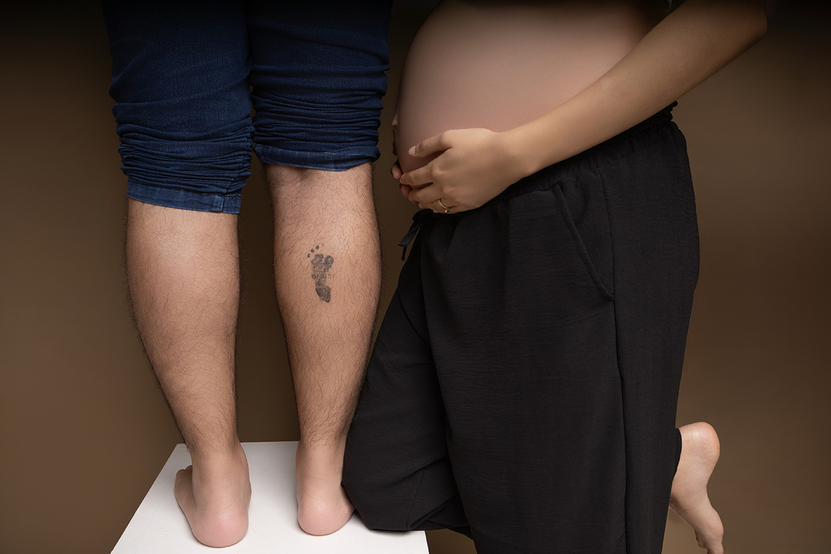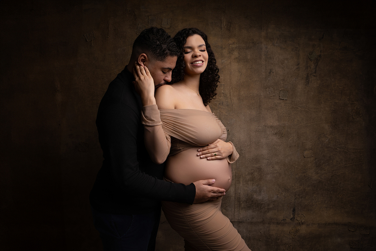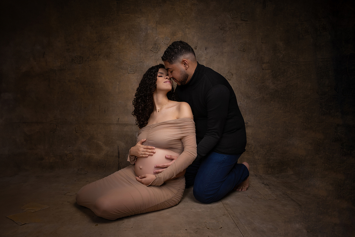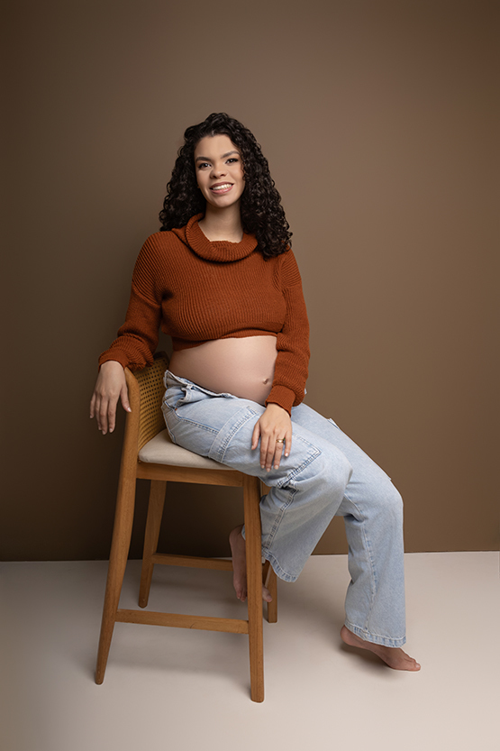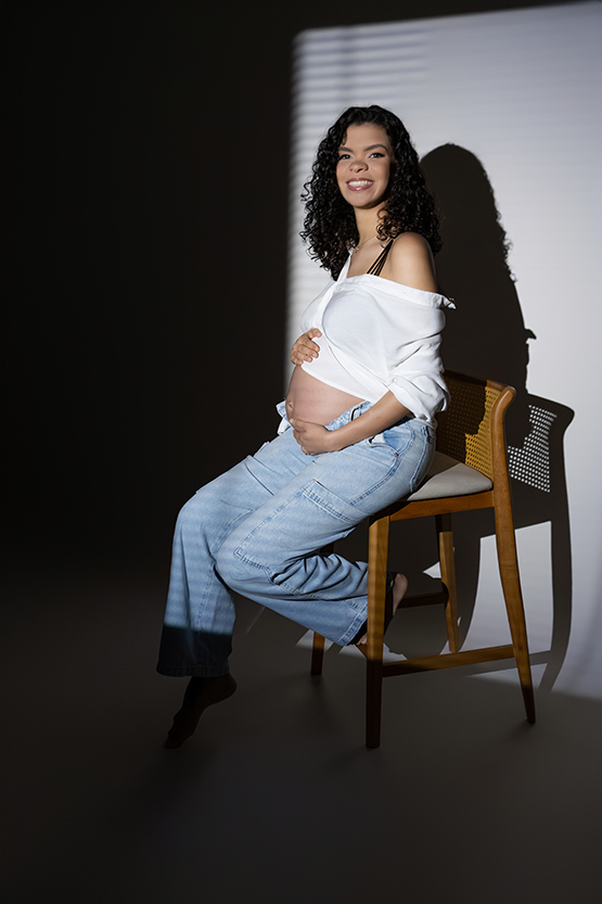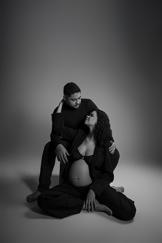 À espera do Heitor, esse ensaio gestante em estúdio, em Ipatinga, foi construído com respeito à trajetória deles. Antes dele, houve o Miguel. E essa presença não desaparece. Ela se transforma, se integra, permanece de um jeito silencioso, mas muito real.